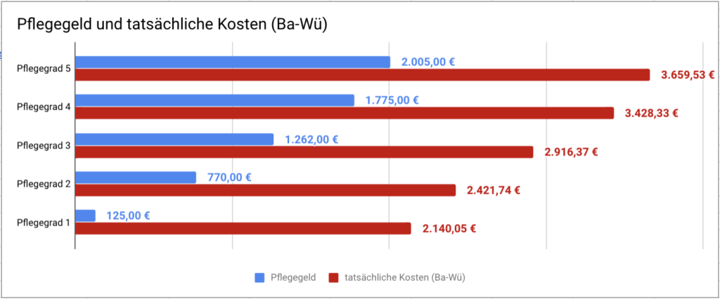 Die Statistik zeigt, dass auch das vollständige Pflegegeld nicht ausreicht, um die tatsächlichen Kosten zu decken, die bei der Vollzeitpflege im Pflegeheim durchschnittlich entstehen. Das bedeutet, dass ein sehr hoher Eigenanteil zu zahlen ist, der für Grenzgänger und Angehörige zu einer schweren finanziellen Belastung werden kann.